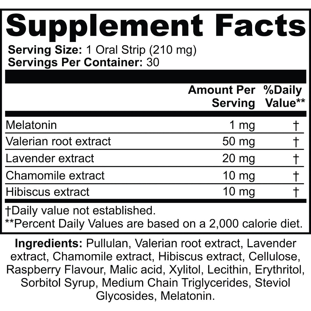 Ingredients: Pullulan, Valerian root extract, Lavender extract, Chamomile extract, Hibiscus extract, Cellulose, Raspberry Flavor, Malic acid, Xylitol, Lecithin, Erythritol, Sorbitol Syrup, Medium Chain Triglycerides, Steviol Glycosides, Melatonin